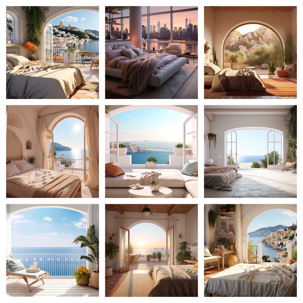 You'll receive 39 high-resolution and lifelike background images of relaxing bedrooms set in various captivating locations. From bustling urban cities to exotic beaches and charming Mediterranean vistas, our backgrounds transport you to your dream destination. These images come in both JPG and PNG formats, with various aspect ratios, giving you the freedom to choose exactly what your viewers see.
